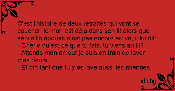 C'est l'histoire de deux retraités qui vont se coucher, le mari est déjà dans son lit alors que sa vieille épouse n'est pas encore arrivé, il lui dit: