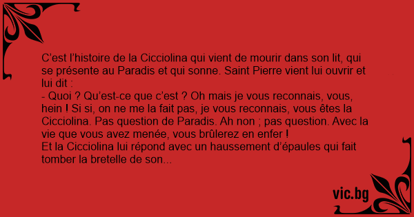C’est l’histoire de la Cicciolina qui vient de mourir dans son lit, qui se présente au Paradis et qui sonne. Sаinт Pierre vient lui ouvrir et lui dit :