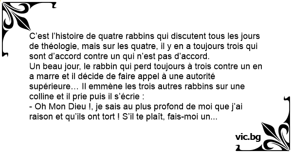 C’est l’histoire de quatre rabbins qui discutent tous les jours de théologie, mais sur les quatre, il y en a toujours trois qui sont d’accord contre un qui n’est pas d’accord.
