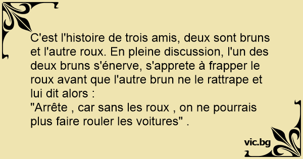 C'est l'histoire de trois amis, deux sont bruns et l'autre roux. En pleine discussion, l'un des deux bruns s'énerve, s'apprete à frapper le roux avant que l'autre brun ne le rattrape et lui dit alors :