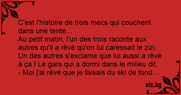 Au petit matin, l'un des trois raconte aux autres qu'il a rêvé qu'on lui caressait le zizi. Un des autres s'exclame que lui aussi a rêvé à ça ! Le gars qui a dormi dans le milieu dit.