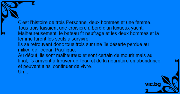 C'est l'histoire de trois Personne, deux hommes et une femme. Tous trois faisaient une croisière à bord d'un luxueux yacht. Malheureusement, le bateau fit naufrage et les deux hommes et la femme furent les seuls à survivre.