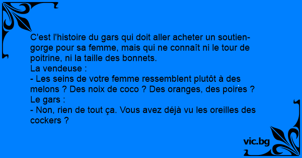 C'est l'histoire du gars qui doit aller acheter un soutien-gorge pour sa femme, mais qui ne connaît ni le tour de poitrine, ni la taille des bonnets.
