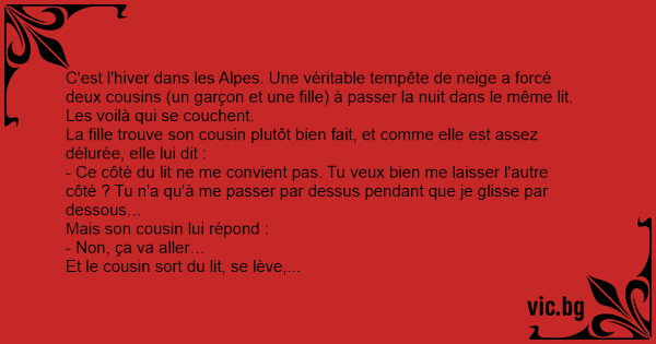 C'est l'hiver dans les Alpes. Une véritable tempête de neige a forcé deux cousins (un garçon et une fille) à passer la nuit dans le même lit.