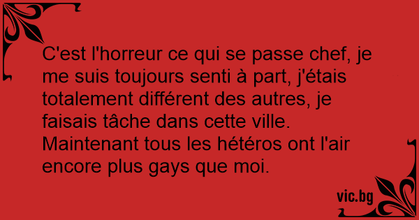 C'est l'horreur ce qui se passe chef, je me suis toujours senti à part, j'étais totalement différent des autres, je faisais tâche dans cette ville. Maintenant tous les hétéros ont l'air encore plus gаys que moi.