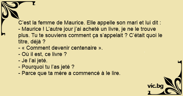 - Maurice ! L’autre jour j’ai acheté un livre, je ne le trouve plus. Tu te souviens comment ça s’appelait ? C’était quoi le titre, déjà ?