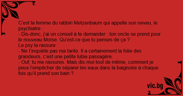 - Dis-donc, j’ai un conseil à te demander : ton oncle se prend pour le nouveau Moïse. Qu’est-ce que tu penses de ça ?