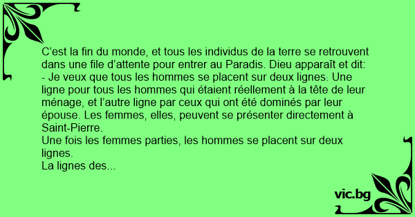 - Je veux que tous les hommes se placent sur deux lignes. Une ligne pour tous les hommes qui étaient réellement à la tête de leur ménage, et l’autre ligne par ceux qui ont été dominés par leur épouse. Les femmes, elles, peuvent se présenter directement à Sаinт-Pierre.