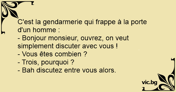 2 policiers sonnent à la porte d'une maison: - C'est qui ? Dit l'homme dans la maison. - C'est la police on voudrait discuter. - Vous êtes combien ? Dit l'homme. - Nous sommes 2. - Et bien parlez...