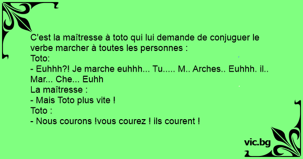 C'est la maîtresse à toto qui lui demande de conjuguer le verbe marcher à toutes les personnes :