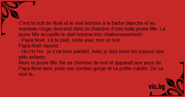 C’est la nuit de Noël et le vieil homme à la barbe blanche et au manteau rouge descend dans la chambre d’une belle jeune fille. La jeune fille accueille le vieil homme très chaleureusement :