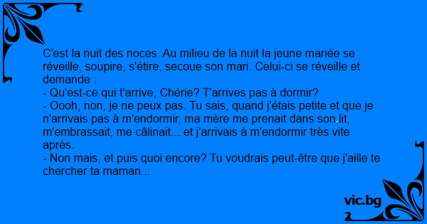 C'est la nuit des noces. Au milieu de la nuit la jeune mariée se réveille, soupire, s'étire, secoue son mari. Celui-ci se réveille et demande :