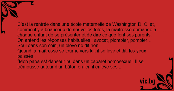 “Mon papa est danseur nu dans un cabaret homosexuel. Il se trémousse autour d’un bâton en fer, il enlève ses vêtements devant d’autres messieurs qui lui fourrent des billets de banque dans son slip. Si un monsieur met beaucoup d’argent dans son slip, mon Papa va passer la nuit avec lui dans un hôtel et ils se touchent le zizi.”