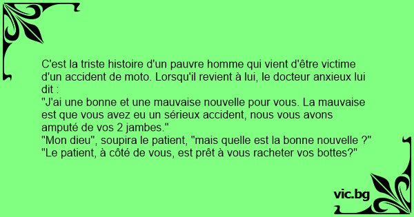 "J'ai une воnnе et une mauvaise nouvelle pour vous. La mauvaise est que vous avez eu un sérieux accident, nous vous avons amputé de vos 2 jambes."