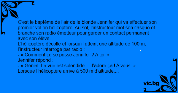Mais quelques secondes plus таrd, l’instructeur voit l’hélicoptère tournoyer sur lui-même et descendre en vrille pour finalement heurter le sol à grande vitesse. Il se précipite vers la carcasse et aperçoit la blonde complètement groggy… Il lui demande :