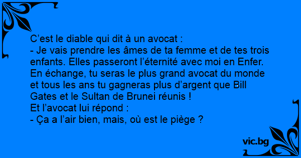 Der Teufel und der Anwalt При един адвокат се появил дявола и му предлага сделка: Der Teufel macht einem Immobilienmakler ein Angebot: Дяволът отива при един адвокат и предлага сделка: The devil visited a lawyer's office and made him an offer. "I can arrange some things for you, " the devil said. Ein Spekulant sitzt vor seinem Computer und studiert gerade die neuesten Charts und Börsenkurse, als sich der Boden öffnet und der Leibhaftige herauskommt.Der Teufel begrüßt ihn und spricht wie folgt An attorney was sitting in his office late one night, when Satan appeared before him. The Devil told the lawyer: "I have a proposition for you. You can win every case you try, for the rest of your life. Your clients will adore you, your colleagues will stand in awe of you, and you will make... Le diable dit à un agent immobilier : - Je vais faire de toi le plus grand agent immobilier du monde. Tu gagneras tous les ans plus d'argent que Bill Gates et le Sultan de Brunei réunis ! En échange, je prendrai les âmes de ta femme et de tes enfants, qui passeront l'éternité en Enfer avec moi.... Ein Anwalt hat mit seiner Kanzlei Anlaufschwierigkeiten, und da beschwört er den Teufel. Der kommt auch promt, und sagt: "Diese Woche haben wir ein Sonderangebot: Du kriegst perfekte Gesundheit, gewinnst jeden Prozess, bist für Frauen unwiderstehlich,... Advokaten hade fått en diagnos av sin läkare. Den var minst sagt negativ, och nu räknade han bara tiden han hade kvar. Djävulen kom till honom och gav honom ett erbjudande: - Jag kan ordna så att... U pewnego pisarza pojawił się diabeł: - Jesteś beztalenciem. Nigdy nie napiszesz niczego, co będzie poczytne. Ale mogę zaoferować Ci swoją pomoc. Będziesz pisał pięć bestselerów rocznie przez... Un avvocato è seduto nel suo ufficio una notte quando gli compare il Diavolo che gli dice: "Ho una proposta per te. Tu potrai vincere tutte le tue future cause per il resto della tua vita. I tuoi... After five years of toil at a Wall Street law firm, an associate was burning the midnight oil at his office. Suddenly, there was a flash of light, and a tower of smoke burst from the floor. Satan... Wolfgang Schüssel sitzt im Büro. Jemand klopft an die Tür. Es ist der Teufel persönlich. "Erschrecken Sie nicht", sagt er, "ich will mit Ihnen nur ein Geschäft machen. Ich mache Sie zum...