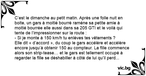 Elle dit « d’accord », du coup le gars accélère et accélère encore jusqu’à obtenir 150 au compteur. La fille commence alors son sтriр-tease… et le gars est tellement occupé à regarder la fille se déshabiller à côté de lui qu’il perd le contrôle de sa voiture et ils font une embardée dans un champ !