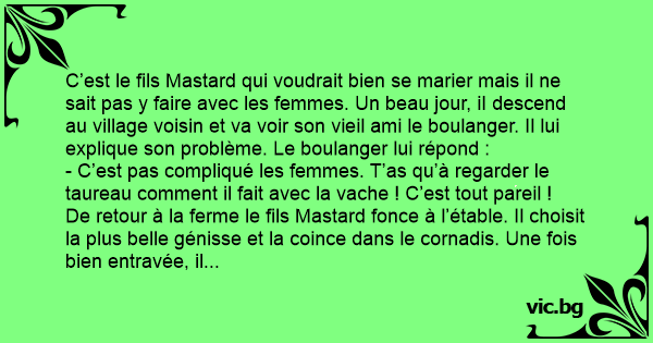 C’est le fils Mastard qui voudrait bien se marier mais il ne sait pas y faire avec les femmes. Un beau jour, iI descend au village voisin et va voir son vieil ami le boulanger. Il lui explique son problème. Le boulanger lui répond :