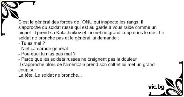 C'est le général des forces de l'ONU qui inspecte les rangs. Il s'approche du soldat russe qui est au garde à vous raide comme un piquet. Il prend sa Kalachnikov et lui met un grand coup dans le dos. Le soldat ne bronche pas et le général lui demande :