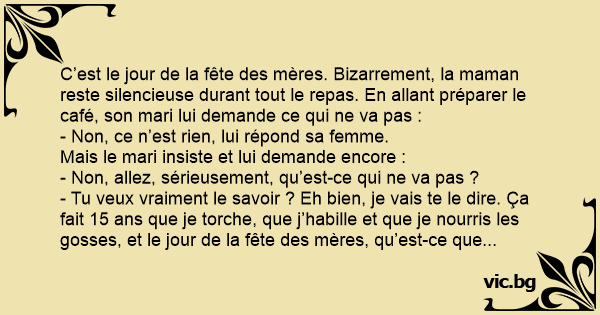 C’est le jour de la fête des mères. Bizarrement, la maman reste silencieuse durant tout le repas. En allant préparer le café, son mari lui demande ce qui ne va pas :