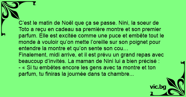 C’est le matin de Noël que ça se passe. Nini, la soeur de Toto a reçu en cadeau sa première montre et son premier parfum. Elle est excitée comme une puce et embête tout le monde à vouloir qu’on mette l’oreille sur son poignet pour entendre la montre et qu’on sente son cou…