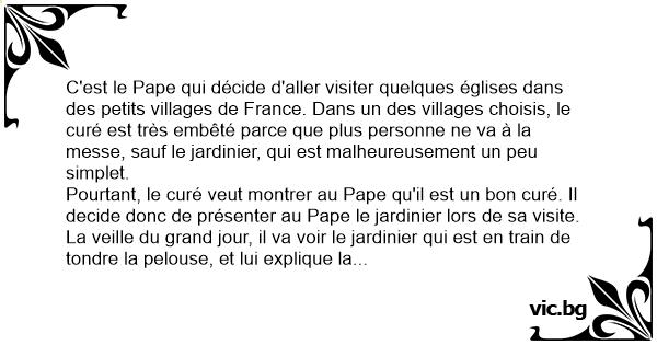 Alors le curé dit "C'est Jésus!! J'ai une idée, je vais le marquer sur votre tondeuse comme ça, vous n'aurez qu'à lire dessus, et le Pape croira que vous connaissez la réponse. Deuxième question: Qui est la mère de Jésus?"