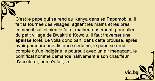 C'est le pape qui se rend au Kenya dans sa Papamobile, il fait la tournée des villages, agitant les mains et les bras comme il sait si bien le faire, malheureusement, pour aller du petit village de Bwakiti à Kowolu, il faut traverser une épaisse forêt. Le voilà donc parti dans cette brousse, après avoir parcouru une distance certaine, le pape se rend compte qu'un indigène le poursuit avec un air menaçant, le pontifical homme demande hâtivement à son chauffeur d'accélérer, rien n'y fait, la Papamobile n'est pas un 4x4, et les routes ne sont pas prévue pour la Mercedes du représentant de la chrétienté; le noir parvient à les rattraper.