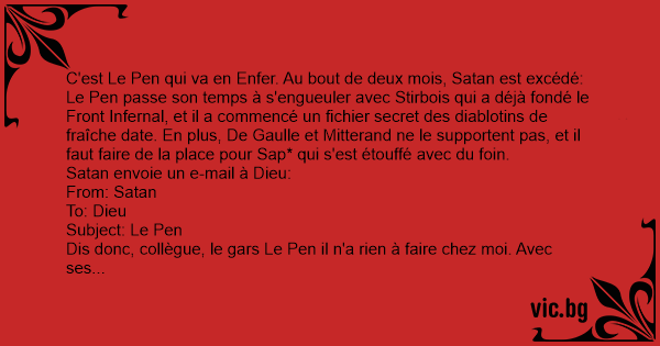 Dis donc, collègue, le gars Le Pen il n'a rien à faire chez moi. Avec ses états de service en Algérie, il a tué le nombre de Sarrasins requis pour entrer au Paradis. Je sais, c'est plus les croisades mais le règlement c'est le règlement. - Satan
