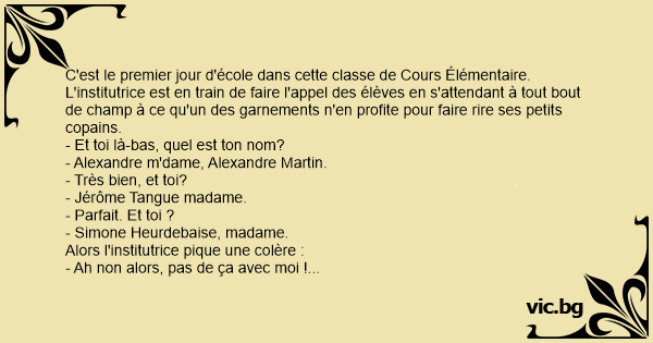 - Mais madame, c'est vraiment mon nom. Vous pouvez aller vérifier chez les CM2 et demander à ma soeur si vous ne me croyez pas !