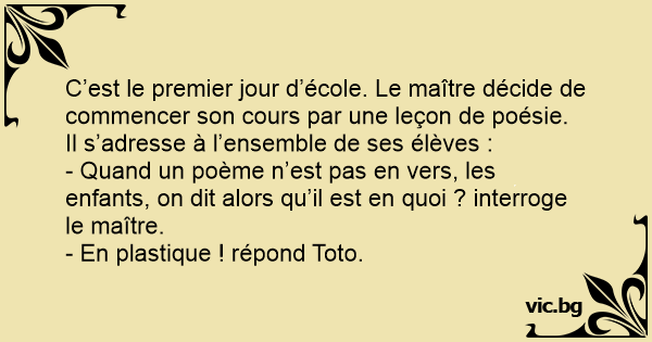 C’est le premier jour d’école. Le maître décide de commencer son cours par une leçon de poésie. Il s’adresse à l’ensemble de ses élèves :