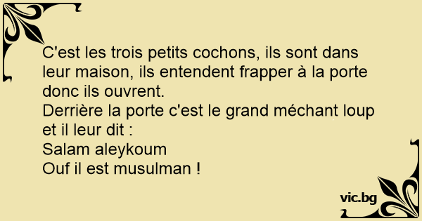 Поросята грають, радіють, веселяться. Раптом до кімнати заходить вовк. Всі завмерли. Вовк: — Ассалам алейкум! Всі полегшено зітхнули. Ну, слава богу, мусульманин.
