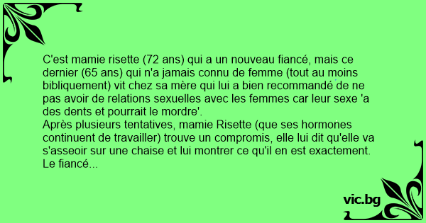 C'est mamie risette (72 ans) qui a un nouveau fiancé, mais ce dernier (65 ans) qui n'a jamais connu de femme (tout au moins bibliquement) vit chez sa mère qui lui a bien recommandé de ne pas avoir de relations sexuelles avec les femmes car leur sexe 'a des dents et pourrait le mordre'.