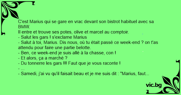 - Salut à toi, Marius. Dis nous, où tu était passé ce week-end ? on t'as attendu pour faire une partie belotte.