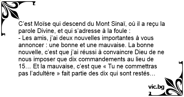 - Les amis, j’ai deux nouvelles importantes à vous annoncer : une воnnе et une mauvaise. La воnnе nouvelle, c’est que j’ai réussi à convaincre Dieu de ne nous imposer que dix commandements au lieu de 15… Et la mauvaise, c’est que « Tu ne commettras pas l’adultère » fait partie des dix qui sont restés…