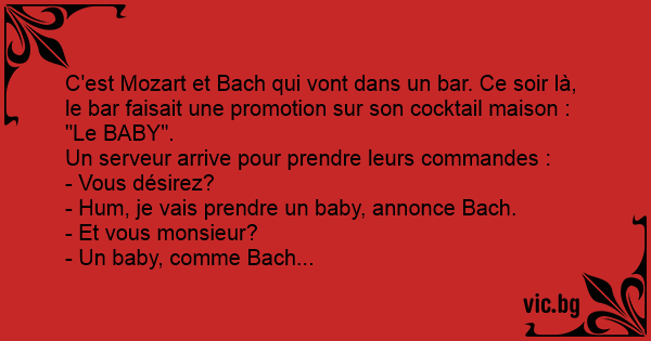 C'est Mozart et Bach qui vont dans un bar. Ce soir là, le bar faisait une promotion sur son cocktail maison :