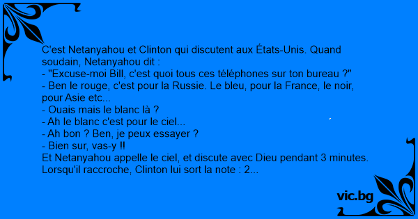 Et Netanyahou appelle le ciel, et discute avec Dieu pendant 3 minutes. Lorsqu'il raccroche, Clinton lui sort la note : 2 millions de dollars :