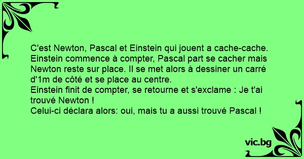 Toti oamenii de stiinta jucau fata'ascunselea in Rai. Se pune Einstein si incepe sa numere. Toti se ascund pe Unde gasesc, numai Newton ia o creta, traseaza un Patrat cu latura de 1 m si se aseaza...
