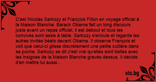 C'est Nicolas Sarkozy et François Fillon en voyage officiel à la Maison Blanche. Barack Obama fait un long discours juste avant un repas officiel, il est debout et tous les convives sont assis à table. Sarkozy s'ennuie et regarde les autres invités béats devant Obama. Il observe François et voit que celui-ci glisse discrètement une petite cuillère dans sa poche. Sarkozy se dit c'est vrai qu'elles sont belles avec les insignes de la Maison Blanche gravés dessus. Il décide d'en mettre lui aussi une dans sa poche. Mais en la prenant, il cogne le verre en cristal s'en faire exprès ce qui fait un Ding retentissant. Obama s'arrête et dit :