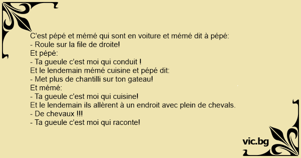 C'est pépé et mémé qui sont en voiture et mémé dit à pépé: