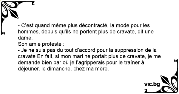 - Je ne suis pas du tout d’accord pour la suppression de la cravate En fait, si mon mari ne portait plus de cravate, je me demande bien par où je l’agripperais pour le traîner à déjeuner, le dimanche, chez ma mère.
