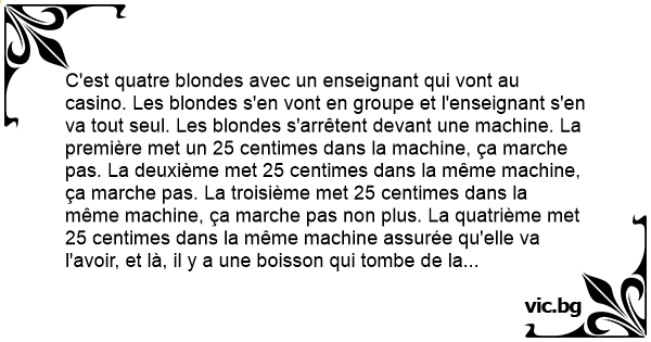 C'est quatre blondes avec un enseignant qui vont au casino. Les blondes s'en vont en groupe et l'enseignant s'en va tout seul. Les blondes s'arrêtent devant une machine. La première met un 25 centimes dans la machine, ça marche pas. La deuxième met 25 centimes dans la même machine, ça marche pas. La troisième met 25 centimes dans la même machine, ça marche pas non plus. La quatrième met 25 centimes dans la même machine assurée qu'elle va l'avoir, et là, il y a une boisson qui tombe de la machine !