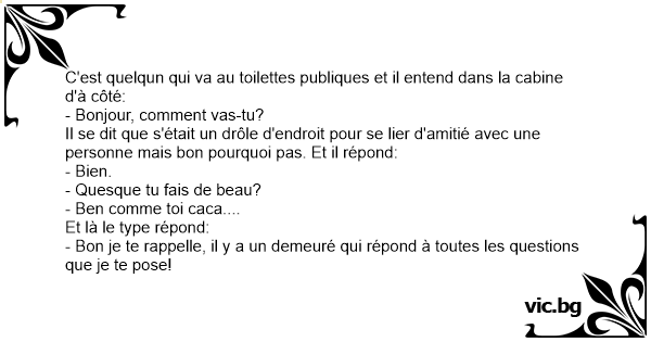 Un gars rentre dans un bar il va aux toilettes et à peine il se met sur la cuvette qu'il entend : "Salut ça va ?" Il se dit que c'est bizarre de se d'amitié dans cet endroit mais bon on ne choisit...