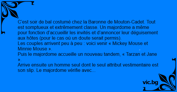 Arrive ensuite un homme seul dont le seul attribut vestimentaire est son slip. Le majordome vérifie avec tact que l’homme en slip figure bien parmi la liste des invités, puis il lui demande :
