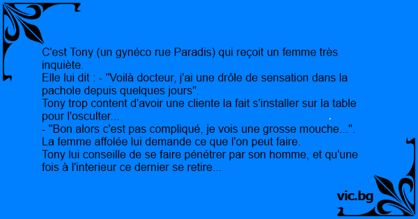 Elle lui dit : - "Voilà docteur, j'ai une drôle de sensation dans la pachole depuis quelques jours".