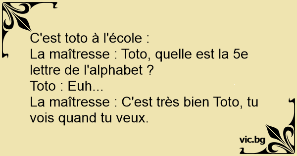 La maîtresse : Toto, quelle est la 5e lettre de l'alphabet ?