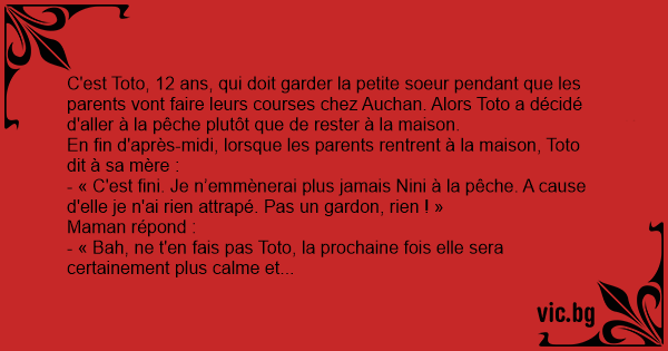 C'est Toto, 12 ans, qui doit garder la petite soeur pendant que les parents vont faire leurs courses chez Auchan. Alors Toto a décidé d'aller à la pêche plutôt que de rester à la maison.
