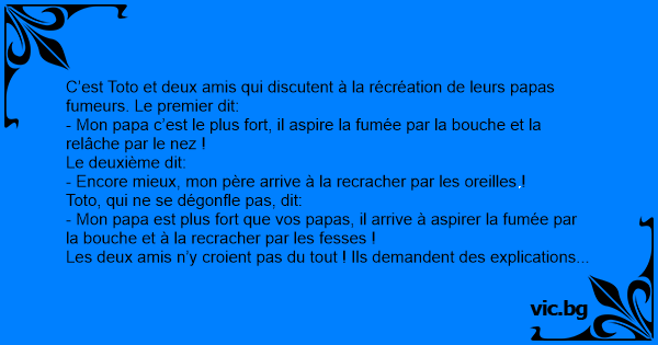 - Mon papa est plus fort que vos papas, il arrive à aspirer la fumée par la bouche et à la recracher par les fesses !