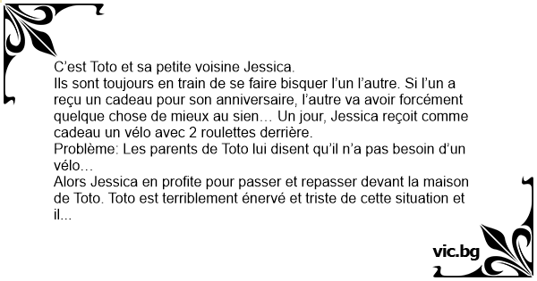 Ils sont toujours en train de se faire bisquer l’un l’autre. Si l’un a reçu un cadeau pour son anniversaire, l’autre va avoir forcément quelque chose de mieux au sien… Un jour, Jessica reçoit comme cadeau un vélo avec 2 roulettes derrière.