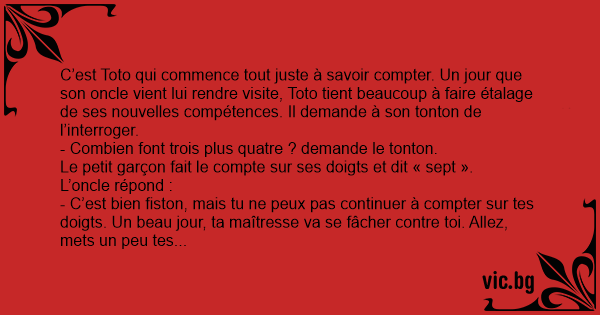 C’est Toto qui commence tout juste à savoir compter. Un jour que son oncle vient lui rendre visite, Toto tient beaucoup à faire étalage de ses nouvelles compétences. Il demande à son tonton de l’interroger.