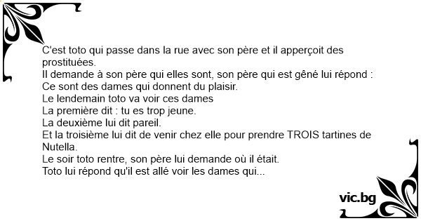Un padre va in ritardo a prendere suo figlio a scuola e lui viene ospitato da tre prostitute che gli danno tre fette di pane e marmellata per merenda. Quando il padre lo va a prendere e gli dice:...